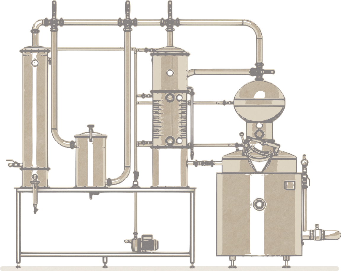 Kolomna Wine and Cognac Factory utilizes high-quality equipment for the production of our distillates. We use a copper alambik "Alexandra" made by industry-leading manufacturer, DES.This equipment features a copper boiler with a stainless steel water steam jacket, operating at a pressure of 0.5 bar and a temperature of 110°C.The concave cube, made of 99.9% pure electrolytic copper, ensures uniform mixing through centrifugal action. The 90 RPM mixer, placed diagonally, operates at significantly lower voltage, directing mass flow vertically for more efficient alcohol evaporation.Our distillation process also includes a Boiling Ball Helmet, which accelerates the steam flow to prevent overpressure and vacuum, and an epuration column with 18 copper plates for extended contact of alcohol vapors with copper and efficient separation into fractions. The reflux condenser, also made of 99.9% pure electrolytic copper, serves to partially condense vapors and return reflux to the column for a more complete separation of the mixture.